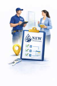 NEW Gebäudereinigung steht für zuverlässige, strukturierte und nachhaltige Reinigungslösungen in Berlin. Wir arbeiten mit klar definierten Reinigungsplänen, festen Ansprechpartnern und transparent kalkulierten Angeboten. Unsere Abläufe sind organisiert, dokumentiert und auf Ihr Objekt individuell abgestimmt. Durch regelmäßige Qualitätskontrollen sichern wir dauerhaft hohe Standards.